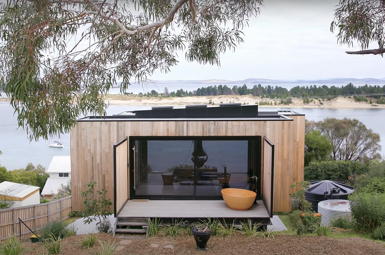 The Pod, described by TV host Peter Madison as a “love letter to Tasmania,” is a tiny home comprised of two living ‘pods’ merged together by a narrow row of skylights. Covering only 430sq-ft, the exterior of The Pod is wrapped in Tasmanian oak wood which is replaced with expansive, floor-to-ceiling windows around the back of the tiny home. Positioned on a hillside, the tiny home’s back pod rises on steel beams to merge with the front pod, giving the illusion that you’re “floating” above the ground, as described by Hansen.