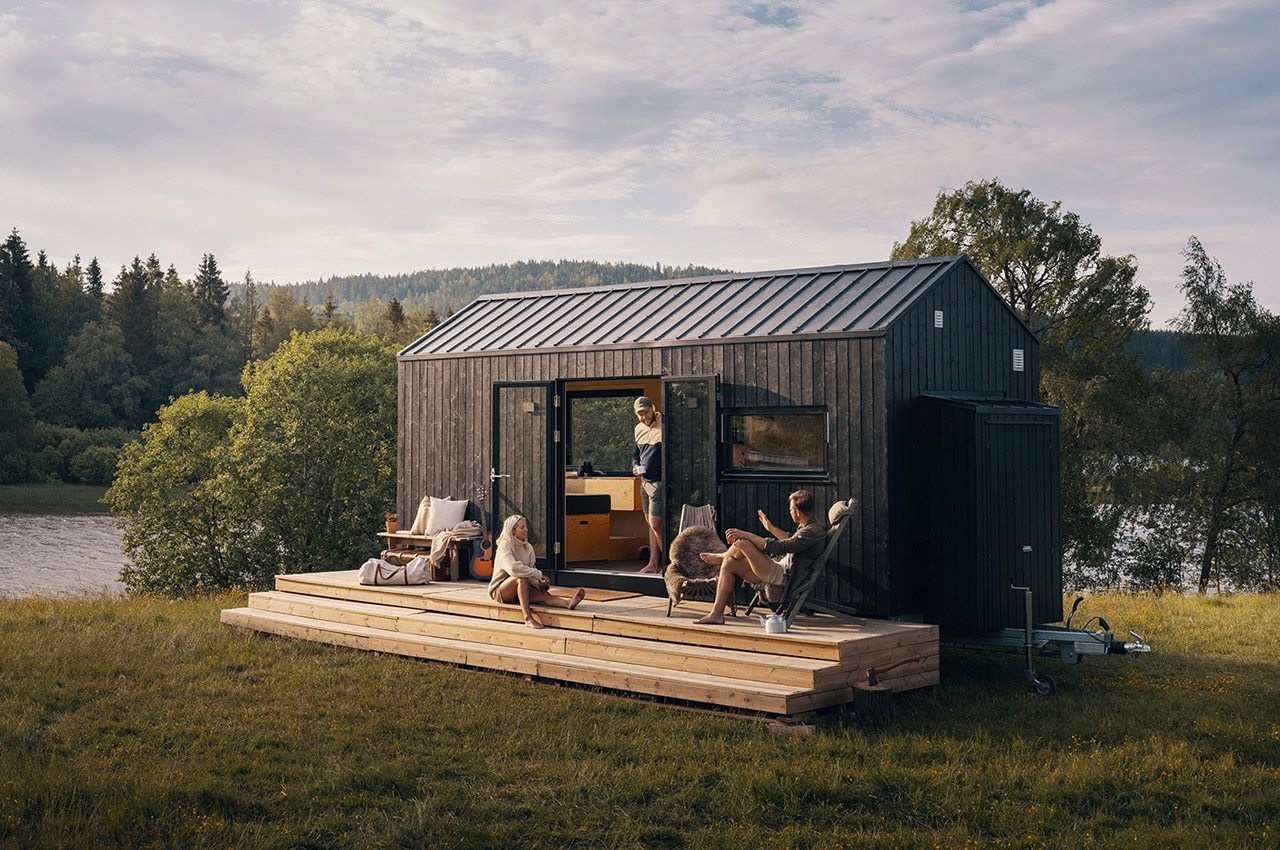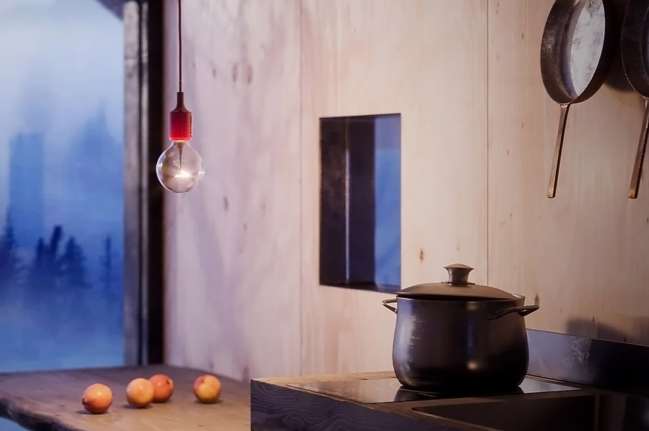 Designed by David and Jeanette Reiss-Andersen of Oslo-based Norske Mikrohus, Rast is a modern tiny home clad in dark-stained Norwegian spruce. It is constructed with Nordic weather conditions in mind – the roof can withstand heavy snowfall and the walls incorporate thick insulation made of wool, glass, and aluminum – all sustainable materials. On sunny winter days, occupants can stay warm and comfortable inside while still feeling tied to the outdoors. “The large window in the shower really puts you in touch with the natural surroundings,” David says.