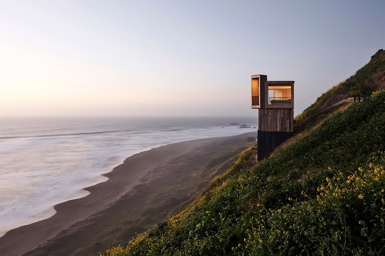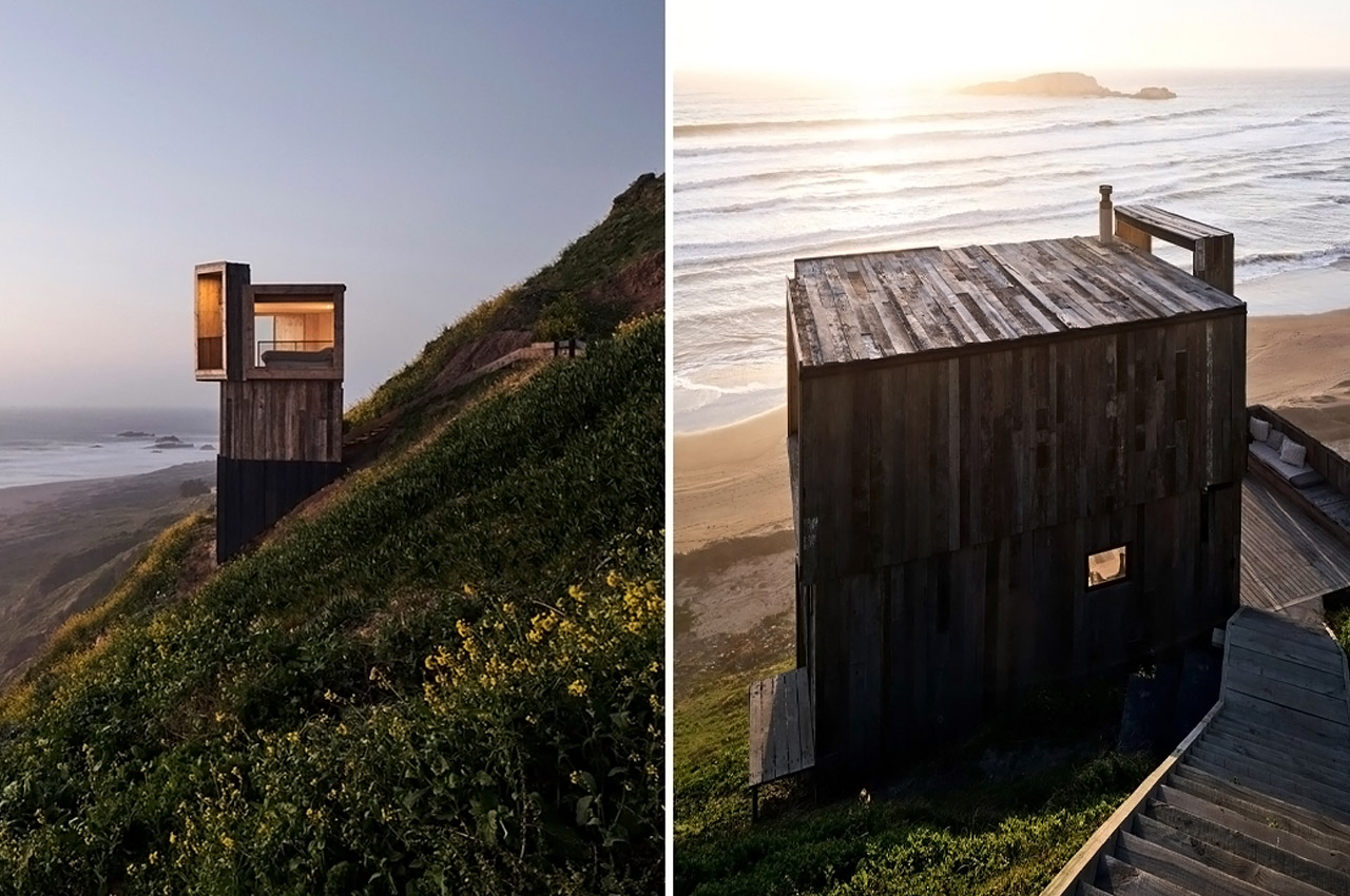Designed and built by Croxatto y Opazo Arquitectos, the holiday cabins are named La Loica and La Tagua and each comprises an individual footprint of less than 25 square meters. Initially conceived of as holiday homes positioned on the coastline of Santiago, La Loica and La Tagua are two-story cabins placed 80 meters above sea level. Getting as close to the Pacific Ocean as possible, the two cabins remain stationed atop the “Lobera,” a large mass of rock that juts out to sea and stands as a home to sea lions and other native sea-dwelling species. Inspired by the windy conditions that Matanzas has become famous for, Croxatto y Opazo Arquitectos played into the wind when designing their holiday cabins.