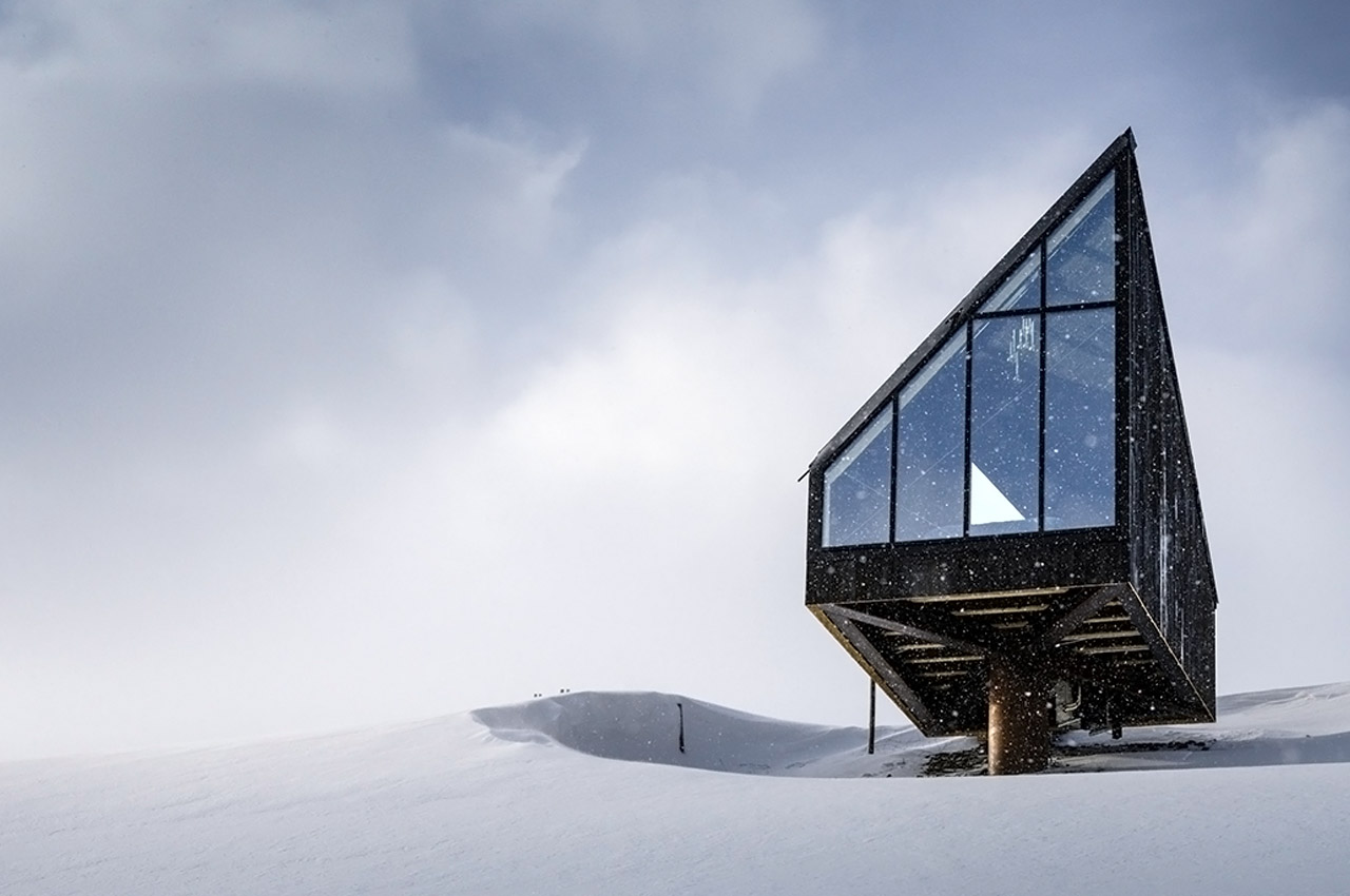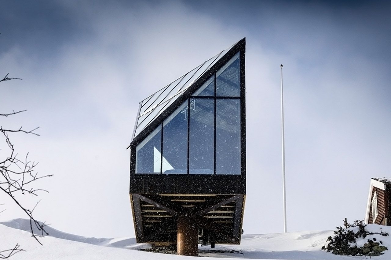 The Diamanten Cabin, which is positioned atop a cylindrical support pillar in Oppdal, Norway, was constructed within its mountainous, pre-existing framework. The architects with A38 Arkitekter centralized environmental harmony in designing their winter annex; adjacent log cabins punctuate corners of the valley where the diamond-shaped cabin perks. The final structure is visually enigmatic, but chameleon-like in its commitment to reinvigorating, yet respecting the community to which it belongs. Nestled nearby traditionally vibrant timber cabins, the Diamanten Cabin is unassuming in size, with a total of only a single, open room.