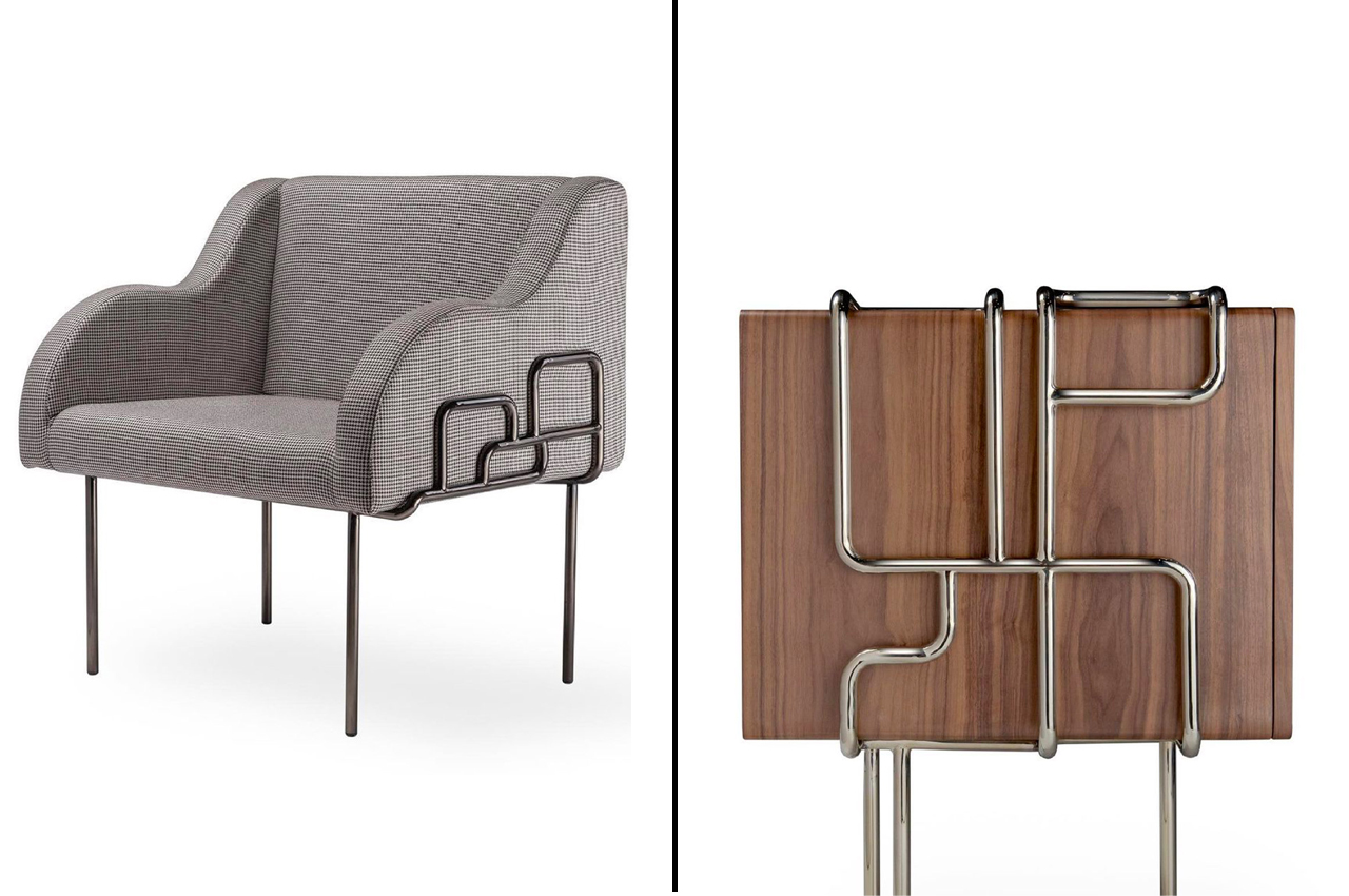 Brazilian designer Carol Gay was originally trained in architecture, but later transitioned to furniture design. She has been nominated for multiple awards, including the XXI TOP Design Award Brazil created by the magazine Arc Design ranking among the three finalists in the lighting category. Her Instagram shows her love of experimenting with materials – be it mixing rocks with glass, or fusing metal to create a geometric base that holds up her furniture design. The molded pipes almost look like paper clips and add a quirky touch to the classic and elegant furniture designs.